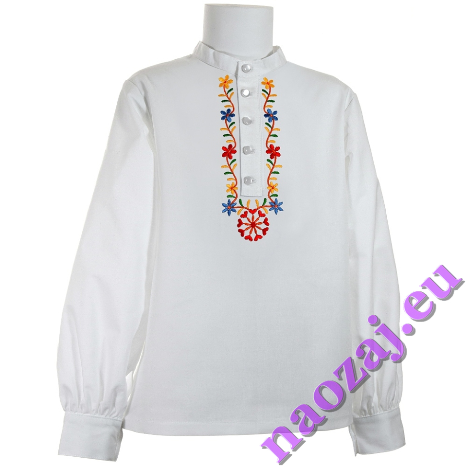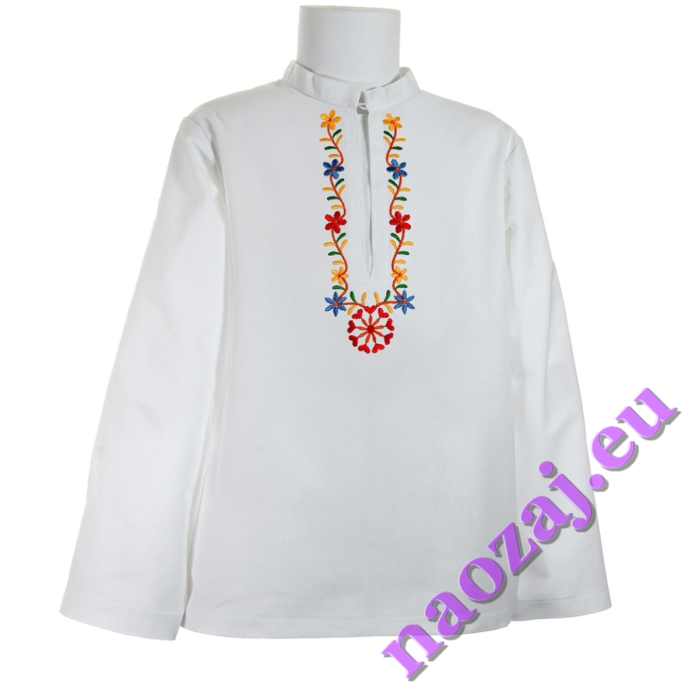 Detská chlapčenská krojová košeľa "Maroško" je zdobená na hrudi hladkovanou výšivkou.