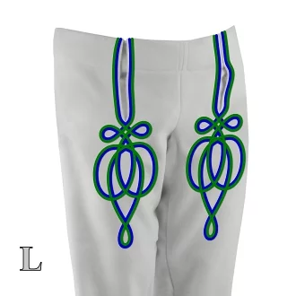 Mužské nohavice z bieleho flaušu, alebo súkna. Zdobenie ľudovým vzorom - šnúra PES.