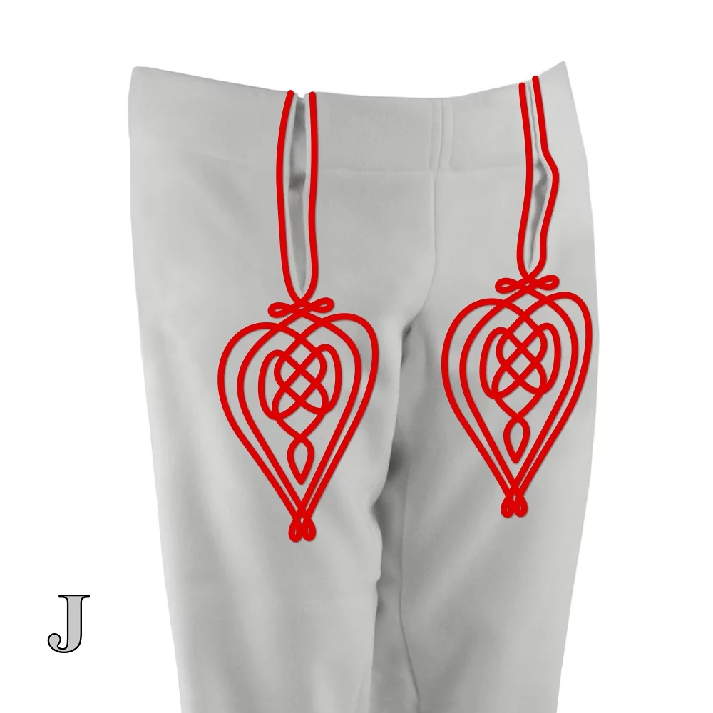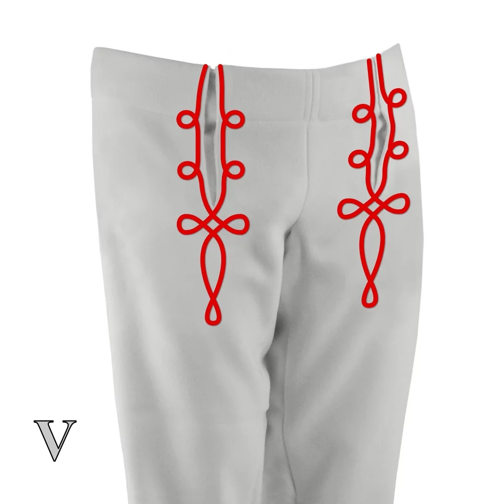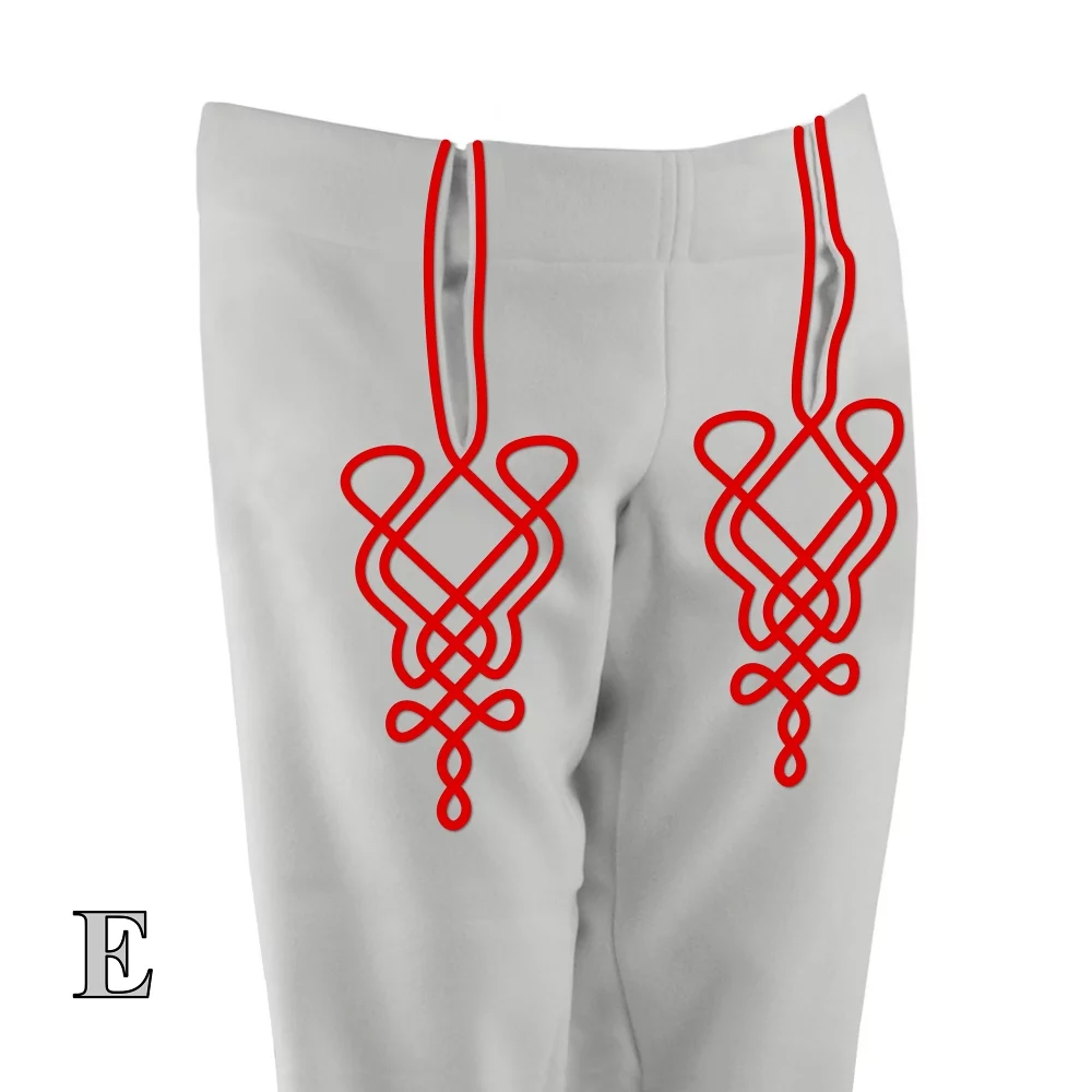 Vpredu boli dva rázporky, cez ktoré sa preťahoval biely batistový ručníček. V páse bol obálok na kožený remeň. Bočné švíky nohavíc a rázporky boli olemované farebnou šnúrou alebo čiernou haraskou.